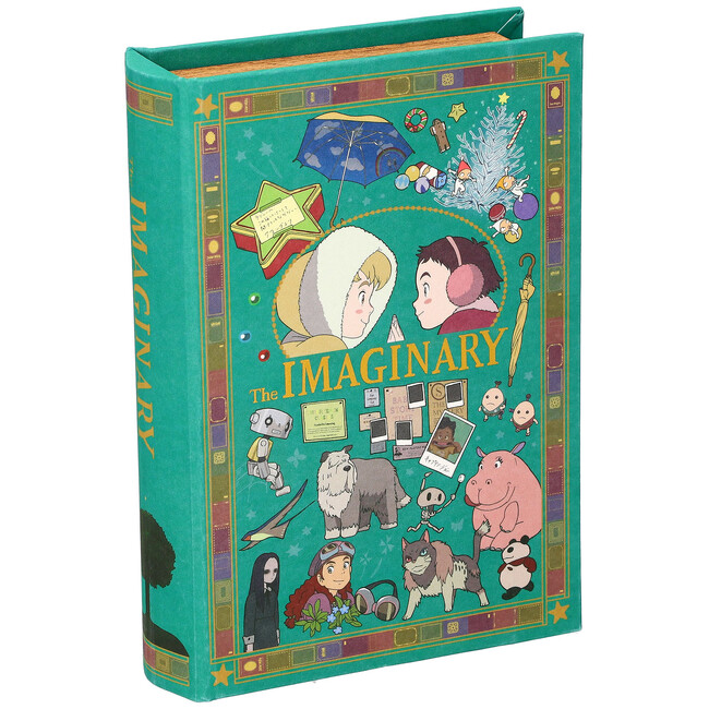 主人公のラジャーとアマンダ、思い出のモチーフやイマジナリたちなど、作品の世界観をぎゅっと閉じ込めたデザインの本型ケースです。本の装丁の枠のデザインは「本の街」にある本の表紙をイメージしています。アクセサリーや思い出の小物を収納して、本のように飾りながら収納することができます。