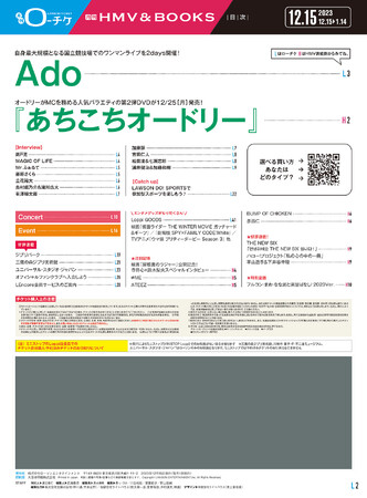 『月刊ローチケ』の表紙には、2024年4月に自身最大規模となる国立競技場でのワンマンライブを2日間開催する「Ado」。そして『月刊HMV&BOOKS』の表紙には、MCを務める人気バラエティ『あちこちオードリー』の第2弾DVDが12月25日(月)に発売の「オードリー」が登場!