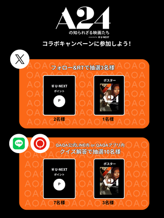 『QAQA』公式LINEまたは『QAQA』アプリ内(※)で出題されるA24作品に関するクイズに解答した方を対象に抽選で合計10名様に賞品をプレゼントします。『QAQA』公式LINEを友だち登録いただくことで参加できます。