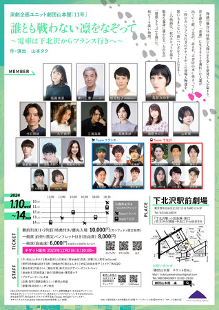 演劇企画ユニット 劇団山本屋主催、「11 号」『誰とも戦わない凛をなぞって〜電車は下北沢からフランス行きへ〜』が 2024年1月10日 (水) 〜2024年1月14日 (日)に下北沢駅前劇場(東京都東京都世田谷区北沢2-11-8TAROビル3F)にて上演されます。 チケットはカンフェティ(運営:ロングランプランニング株式会社、東京都新宿区、代表取締役:榑松 大剛)にて発売中です。