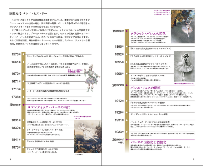 バレエの成り立ちをから栄華盛衰のバレエ通史の入門書として唯一無二、貴重なビジュアル多数掲載。