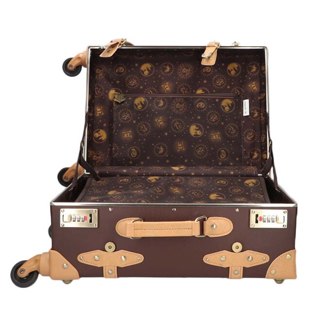 先行受注予約を受け付けていたトランクキャリーケースを、店頭とオンラインショップにて12月中旬より順次販売を開始いたします。ホグワーツ魔法魔術学校に通う生徒がホグワーツ特急で移動する際に使用するトランクをイメージしたキャリーケースは、表面は高級感のある合成皮革を使用し、ホグワーツのエンブレムが大きくプリントされています。内生地は、コンパクトボストンバッグとマルチポーチセットと同柄のテキスタイルを使用しています。機内持ち込み可能な2泊3日の旅行に最適なサイズで、ダイヤルロック錠付きのため旅行中も便利に使用できます。