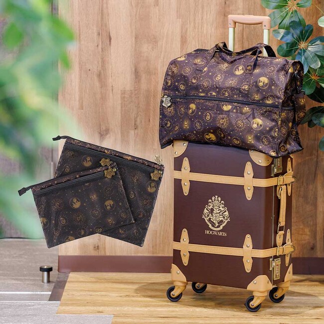 作中に登場するモチーフをあしらったデザインの「ハリー・ポッター ホグワーツトラベルシリーズ」より、コンパクトボストンバッグとマルチポーチセットが登場します。いずれもホグワーツ各寮の象徴動物やホグワーツ魔法魔術学校のシルエット、イニシャルの「H」などのアートワークをアンティークな色合いでデザインしたテキスタイルを使用しています。コンパクトボストンバッグは小さく折りたたみコンパクトに持ち運ぶことができる他、同シリーズのトランクキャリーケースの持ち手に通して、キャリーオンバッグとして使用可能です。マルチポーチセットは幅約33cm高さ約21cmのMサイズと、幅約37cm高さ約28cmのLサイズの2サイズ展開で、キャリーケースの中を綺麗に仕分けて収納するのに便利なポーチです。普段使いとして、コスメポーチやステーショナリー入れなどの様々な用途で使用できます。