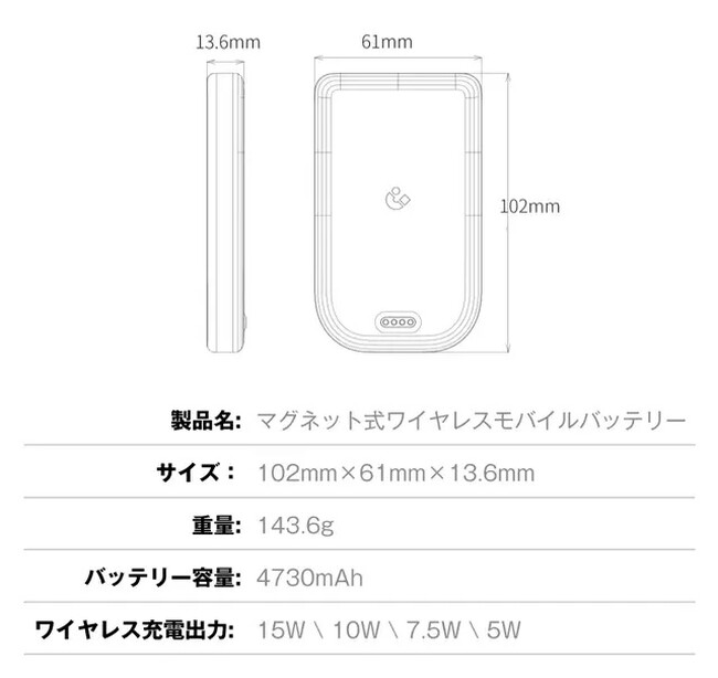 モバイルバッテリーの重さはわずか143.6gで、iPhone13なら1回分以上、iPhone SE(第3世代)なら2回以上フル充電可能。ワイヤレス充電が未対応のスマートフォンにはUSB-Cケーブルを利用しての充電も可能。