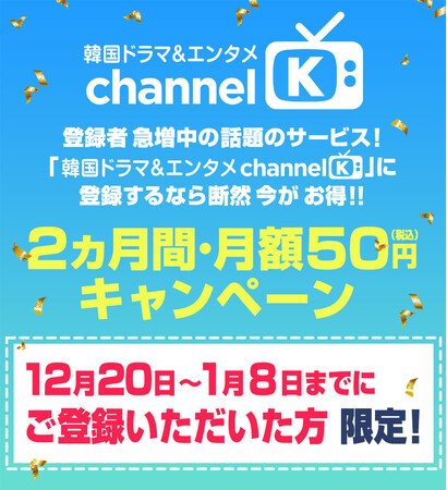 “チャンネルK”を最初の2カ月間・月額50円(税込)でお試しいただけるのは、12月20日(水)〜1月8日(月)の期間中にご登録いただいた方限定!