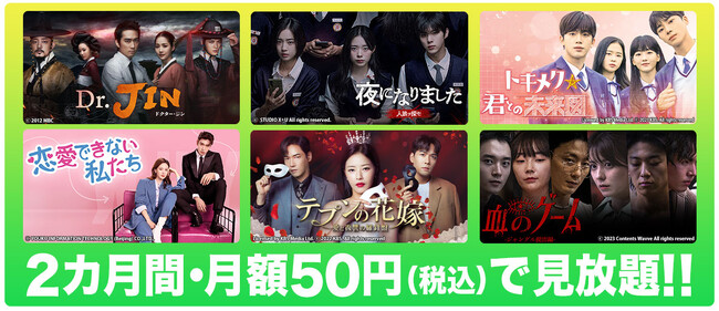 キム・ウソク主演で話題の最新学園スリラー「夜になりました〜人狼ヲ探セ〜」や、ジェジュンが時代劇に初挑戦した「Dr.JIN」など、国内独占配信を含む全てのコンテンツを月額50円で楽しめるのは今だけ!