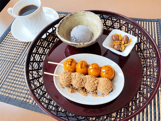 温かい団子に黒砂糖をまぶし、丸い黒ゴマアイス、どんぐりをイメージした チョコレートなどがセットになったメニュー。”黒い姿の物”がでてくるかも...