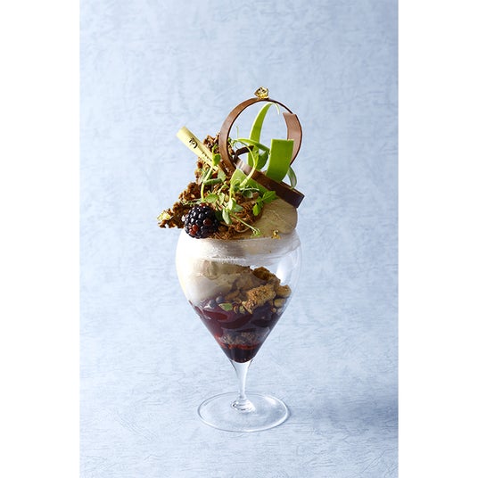 カカオの食感と塩味のあるマイクロハーブで自然の美しさと食べ進めることで味わいが混ざりあって完成するパフェです。