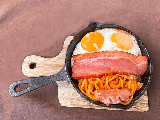 シンプルなナポリタンにベーコンと目玉焼きをのせ、調理中の火の悪魔もいっしょに仕上げました。