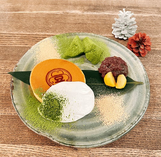 ふんわり生地にたっぷりの豆乳ホイップ、あんこ、抹茶わらび餅を添えました。