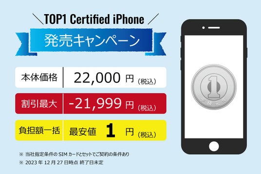 株式会社ディ・ポップス(所在地:東京都渋谷区渋谷、代表取締役:後藤 和寛)が運営する、複数の通信会社の中から、自分に合った通信会社を選べるスマホ相談窓口 『TOP1(トップワン)』にて、TOP1が認定した中古品のSIMフリー版 iPhoneを『TOP1 Certified iPhone』として、2023年12月27日よりTOP1全32店での取扱いを開始致します。