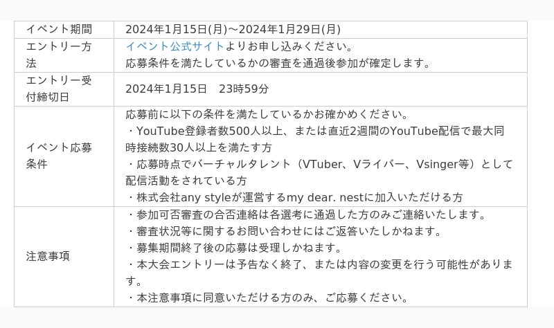 株式会社DEDNOH(本社:東京都渋谷区、代表取締役:押田大輝)は、株式会社any style(本社:東京都港区、代表取締役:萩原湧人、以下「any style」)との共同イベント「ファン参加型VTuberちびキャラ化コンテスト お題に合わせてあなたの推しを大変身!」を2024年1月15日(月)から2024年1月29日(月)まで開催することをお知らせします。