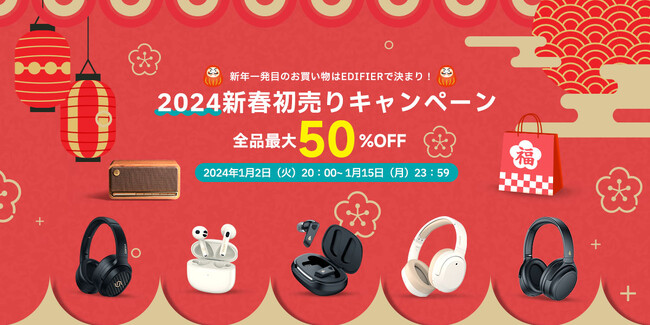 EDIFIERが、2024年新春を盛り上げる初売りキャンペーンを開催します!この新年の幕開けに、お客様にとって最高の音響体験をお届けするため、イヤホン、ヘッドホン、スピーカーを含む全商品を最大50%OFFで提供いたします。さらに、新年限定の豪華福袋や、当選確率100%のラッキールーレットで、素敵なプレゼントをゲットするチャンスも!この機会に、EDIFIERの高品質な製品をお得にお楽しみください。