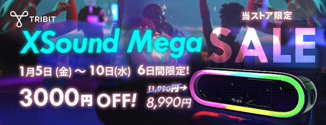 日本、アメリカ、カナダ、イギリス、スペイン、ドイツをはじめ20数か国向けに700を超える高品質なオーディオ機器やPC周辺機器、日用雑貨などの製品を提供するサウザンドショアス株式会社は、自社ブランドのTribitより2024年1月5日(金)〜10日(水)まで6日間限定で、楽天市場にてTribitのBluetoothスピーカー「XSound Mega」の3,000円OFFセールを開催いたします。