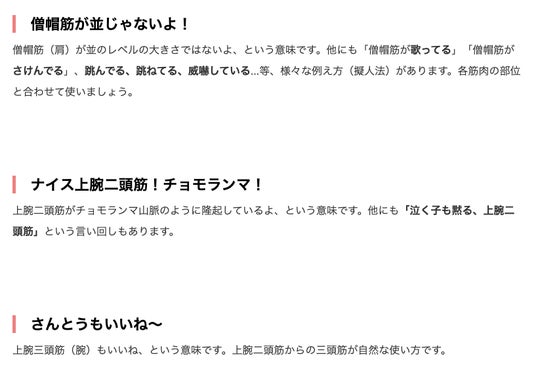 掛けの基本は筋肉の部位を「褒める」「擬人化する」「モノに例える」。