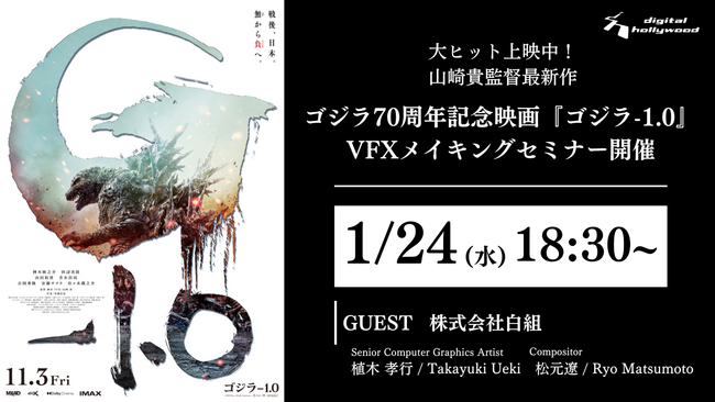 IT 関連及びデジタルコンテンツの人材育成スクール[デジタルハリウッド] (運営会社:デジタルハリウッド株式会社、本社/本校:東京都千代田区、代表取締役社長兼 CEO:吉村毅、学長:杉山知之)では、2023年11月に公開され大ヒット上映中の山崎貴監督最新作、映画ゴジラ70周年記念『ゴジラ-1.0』を制作した、株式会社白組にてSenior Computer Graphics Artistを務める植木孝行氏と、Compositorの松元遼氏をお迎えし、『ゴジラ-1.0』VFXメイキングセミナーを、1月24日(水)に開催いたします。