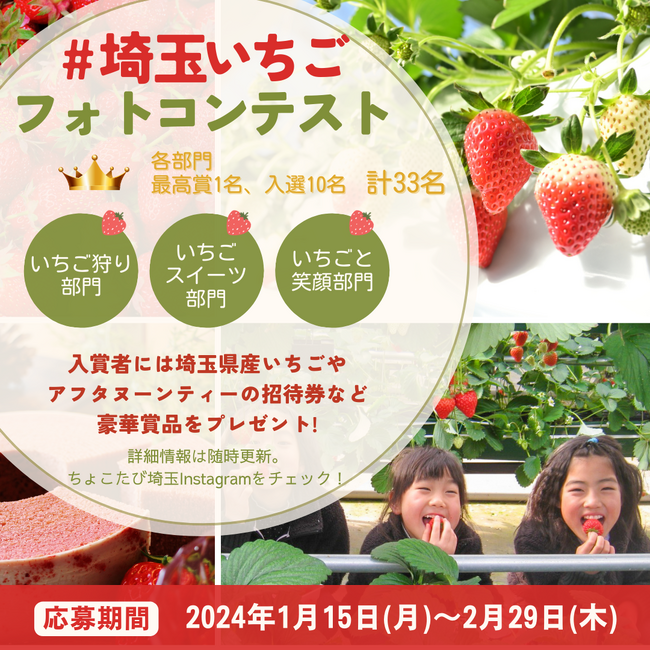一般社団法人埼玉県物産観光協会(会長:朝霧重治)は、「埼玉のいちご」をテーマとしたInstagramフォトコンテストを1月15日(月)より開催いたします。 コンテンスト入賞者の方には、埼玉県産のいちごやアフタヌーンティーの招待券などの賞品をご用意しています。 この機会にぜひ、最もおいしいいちごを生産している県として「プレミアムいちご県」(※)に認定された埼玉県で、観光を楽しみながら埼玉のいちごを味わってみてはいかがでしょうか。 皆様からのご応募をお待ちしております。