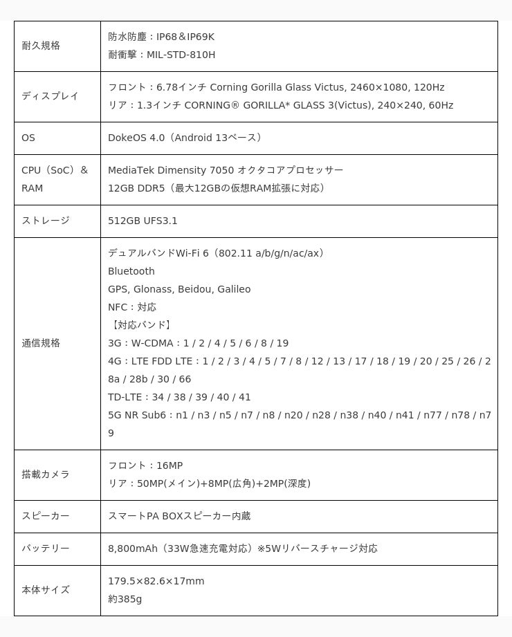 IP68&IP69Kの防水防塵規格、MIL-STD-810Hの耐衝撃性を備えたタフネススマートフォンであり、5G通信にも対応。デュアルスクリーン搭載、MediaTek Dimensity 7050 オクタコアプロセッサーを採用するなど、頑丈かつ高性能なAndroidスマホとなっています。