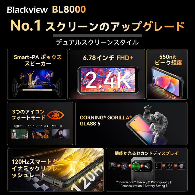 Blackview BL8000のウリは頑丈さです。IP68/IP69K等級の防水防塵規格、軍事規格のMIL-STD-810H耐衝撃性能を擁しています。またデュアルスクリーンには通常の4倍の傷耐性を誇る強化されたCORNING(R) GORILLA(R) GLASS 5を採用。-40℃〜80℃までの極端な温度環境にも対応できるなど、あらゆる環境で使用可能なタフネススマホとなっています。