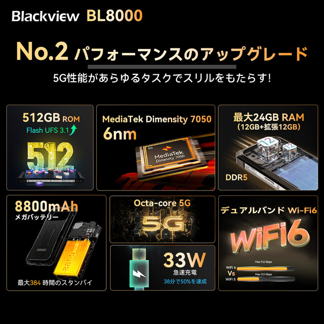 Blackview BL8000はCPU(SoC)にMediaTek Dimensity 7050オクタコアプロセッサーを採用。12GB DDR5 RAMを備えており、最大12GBの仮想RAM拡張も可能となっています。ストレージには512GB UFS3.1 ROMを用意しており、大量のデータを保存しておくこともできます。