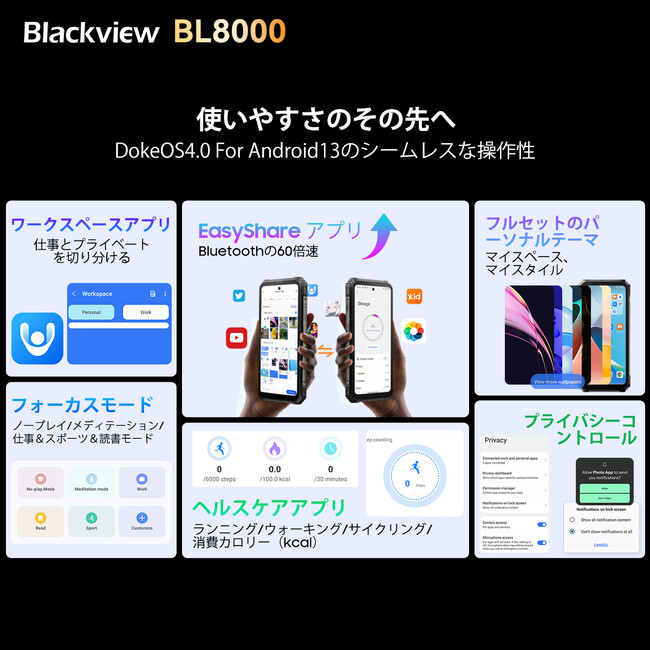 Blackview BL8000はAndroid13をベースとした最新OS「DokeOS 4.0」を採用しており、多くの便利機能が用意されています。便利さ、滑らかさ、プライバシー、およびパーソナライズといったあらゆる面での利便性が強化されています。