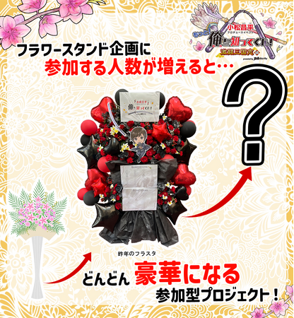 『俺を知ってくれ!』第2弾のフラワースタンド企画は、参加する人数が増えるとどんどん豪華になる参加型プロジェクト! 皆の力を合わせて、世界一豪華なフラワースタンドを作っていきましょう! 新しい仕組みに加え、昨年同様、参加した人全員のハンドルネームが載る差し札と、小松さんがハンドルネームを読み上げるお礼動画をお届け。
