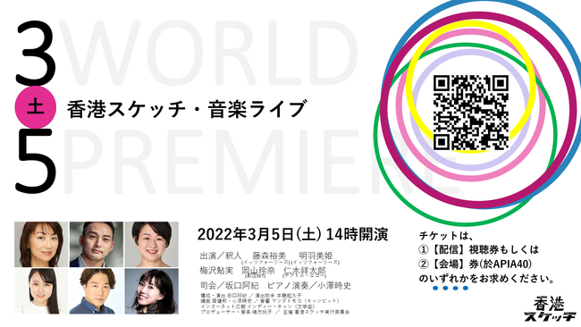 『香港スケッチ・ワールドプレミア音楽ライブ』が2022年3月5日(土)にAPIA40(東京都目黒区)にて上演されます。チケットはカンフェティ(運営:ロングランプランニング株式会社、東京都新宿区、代表取締役:榑松 大剛)にて会場チケット・配信チケットともに発売中です。