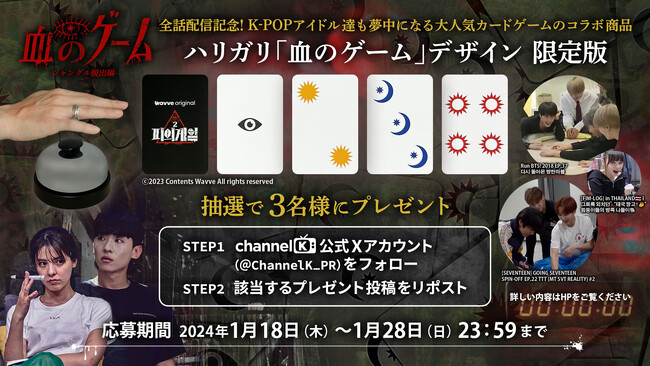 『ハリガリ』とは、数多くのK-POPアイドル達がバラエティ番組やスケジュールの空き時間にプレイする、中毒注意の病みつきカードゲームです。この機会にぜひ「血のゲーム-ジャングル脱出編-」デザインの限定版『ハリガリ』をGETして、ぜひ ご家族・ご友人と手に汗握る勝負を体験してみてはいかがでしょうか…?