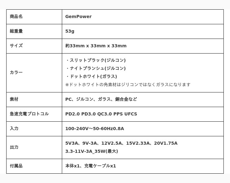 「GemPower(ジェムパワー)」は、高性能なGaN(窒化ガリウム)半導体を使用し、33×33×35mmの超小型でありながら最大35Wの急速充電を実現!重さは約53gと持ち運びに邪魔になりません。