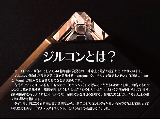 さらに、地球最古の宝石とも呼ばれ、美しく光るジルコンが高級感を演出。