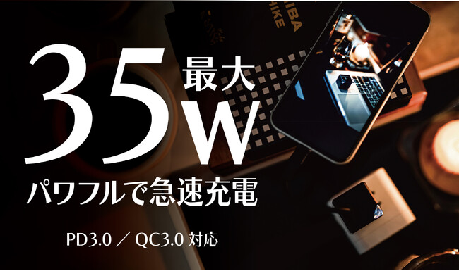 急速充電を実現する35W出力と、100-240Vの広範囲電圧、USB-Cポートを備え、多様なデバイスに対応します。