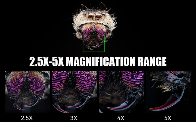 2〜5倍の倍率範囲: マクロ撮影に特化したこのレンズは、2:1〜5:1の専用倍率範囲で優れた性能を発揮します。原寸大を超える画像を撮影することができ、細部のクローズアップ撮影に理想的な選択肢となり、特に、無限遠フォーカスに対応しておらず、マクロ用途へのこだわりが強調されています。