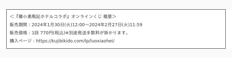 株式会社KADOKAWA(本社:東京都千代田区、取締役 代表執行役社長 CEO:夏野 剛、以下 KADOKAWA)は、運営するオンラインくじサービス「くじ引き堂」において、『ホテルニューオータニ×羅小黒戦記』のオリジナル商品が手に入る<『羅小黒戦記ホテルコラボ』オンラインくじ>を、2024年1月30日(火)12時より販売します。