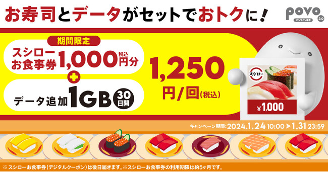 KDDI、沖縄セルラーは2024年1月24日から1月31日まで、povo2.0において、スシローの「お食事券 1,000円分」とpovo2.0の「1GB(30日間)」がセットになったトッピングを提供します。