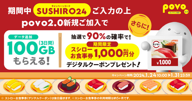 キャンペーンコード「SUSHIRO24」を入力のうえ、povo2.0に新規加入(SIMの有効化)をいただくと、「100GB(3日間)」をプレゼントします。さらに、抽選で90%の確率(注1)で「スシローお食事券」1,000円分があたります。「スシローお食事券」と引き換え可能なデジタルクーポンは当選者へのみ、2024年2月上旬ごろにメールで送付予定です。なお、新規契約のお客さまも他社からの乗り換えのお客さまも対象です。