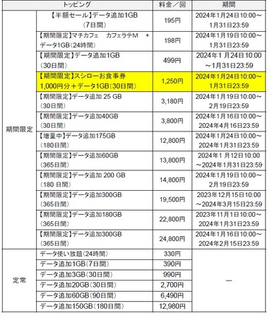 (参考)提供中のデータトッピング一覧(2024年1月24日時点)