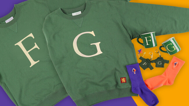 メインアイテムとなる「ラッセルアスレティック トレーナー」は、ウィーズリーおばさんがフレッドとジョージに編んでくれたセーターをインスパイアし、FとGのイニシャルをそれぞれ前面に大きくデザインした、老舗ブランド「RUSSELL ATHLETIC(ラッセルアスレティック)」とのコラボレーショントレーナーです。裾部分にラッセルアスレティックのロゴとグリフィンドール寮の獅子のマークがあしらわれています。同じくハリーとロンがウィーズリーおばさんからもらったイニシャルニットをイメージしたHとRの柄の2種類も登場します。映画に登場するアイテムをオマージュしたデザインながら、老舗ブランドならではの着心地にこだわった本格的なトレーナーです。
