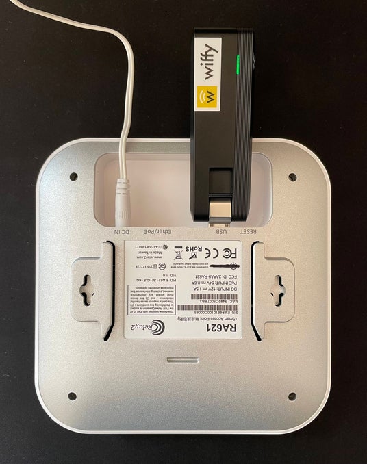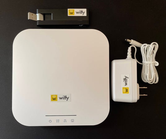 以下の画像はOWE対応のパケ放題Wi-Fiキットです。キットには、無線親機、電源アダプター、4G/LTE通信ドングルがセットとなっています。