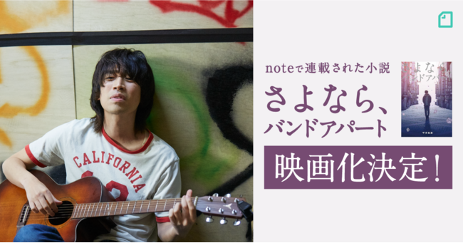 メディアプラットフォームnoteで、バンド「juJoe」ボーカル兼ギターの平井拓郎さんが連載した小説「さよなら、バンドアパート」が、2022年夏に映画化されます。平井さんは、2013年ごろのバンドシーンの思い出や小説作品をnoteに投稿したところ話題となり、2021年7月に『さよなら、バンドアパート』として書籍化。小説を映画化した本作品は、シネマート新宿ほかで全国公開されます。 「だれもが創作をはじめ、続けられるようにする」をミッションに掲げるnoteは、これからもクリエイターのみなさんの活動をサポートしていきます。