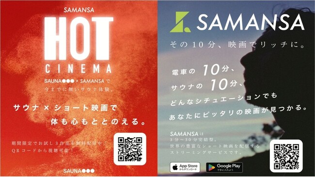 株式会社SAMANSAは、東京・大阪・福岡に店舗を持つプライベートサウナ施設「SAUNA OOO」とのコラボ企画をスタート。サウナ利用者は施設内のQRコードを通じてSAMANSAの人気作品を視聴でき、体も心もととのう体験を味わうことができる。今後もサウナ×ショート映画のように新しい体験を提供するため、様々なシチュエーションで映画を視聴できるようにしていく予定。