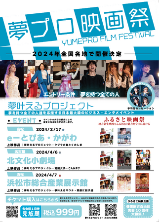 夢を持つ全ての人達を応援する日本最大級のエンタメ・ビジネスコンテスト“夢叶えるプロジェクト”。そして、地方創生をテーマにオリジナル映画の上映を実施し映画と地方創生が連携した日本初のイベント“ふるさと映画祭”がコラボ。高松市後援のもと、2024年2月17日(土)e-とぴあ・かがわにて「夢叶えるプロジェクト2024 高松大会」、「夢プロ映画祭 in 高松」を開催します。
