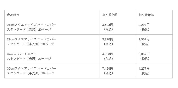 対象商品:21cmスクエア、A4タテ、A4ヨコ、30cmスクエアのハードカバー商品