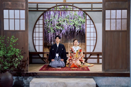 京の町屋をイメージした藤の世界は、和装がよく映えるセット。儚くも美しい雰囲気の一枚を演出します。