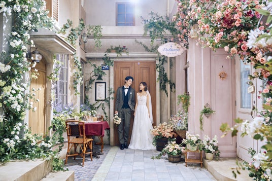 スタジオセットは、全国の『studio LUMINOUS』で人気のあるフラワーゲートやウィステリアを中心に様々なシーンをご用意しております。緻密に計算され、複雑に組み合わさったセットの数々は、単体でも美しい絵を表現していますが、角度を変えて見ると隣り合うセットが重なりあい、また別の世界を作り出します。