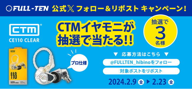 ヒビノ株式会社(本社:東京都港区、代表取締役社長:日比野晃久)EC事業統括部「FULL-TEN」は、2024年2月9日(金)から23日(金)の期間中、公式Xアカウント(@FULLTEN_hibino)にてフォロー&リポストキャンペーンを実施します。ご応募いただいた方の中から、世界のプロから支持されるイヤーモニターブランド“CTM”による、ユニバーサルIEM「CE110 CLEAR」を抽選で3名様にプレゼントいたします。ぜひ奮ってご参加ください。