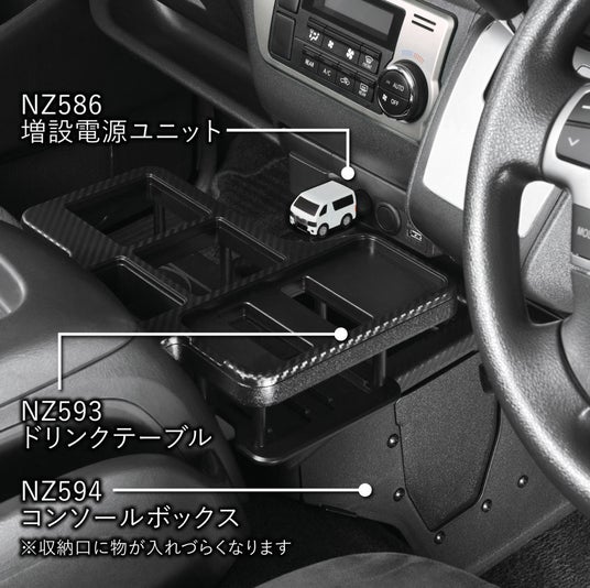 純正のカーソケットだけでなく、当社ハイエース用増設電源ユニット (NZ586) にも使うことができます。また、ドリンクテーブル(NZ593)やコンソールボックス(NZ594)とも併用可能です。