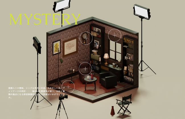 SAMANSAで見られる短編映画『グッドストーリー』に出てくるクラシカルな椅子とテーブルや、短編映画『亡命者』からイメージした、往年の雰囲気を醸し出し、部屋に時の経過と謎めいた空気感を加えてくれるヴィンテージの部屋。冷静で論理的な思考、観察・推理力で難解な事件を解決するミステリー映画のような、シックな色合いと上品さで深みのあるデザインに。