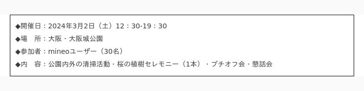 株式会社オプテージ(大阪市中央区)は、携帯電話サービス「mineo(マイネオ)」が運営しているコミュニティサイト「マイネ王」内のポジティブ(HAPPY)な投稿を活用した社会貢献活動「mineo HAPPY STORY」の一環として、舞子公園(神戸)および大阪城公園に桜の植樹を行います。