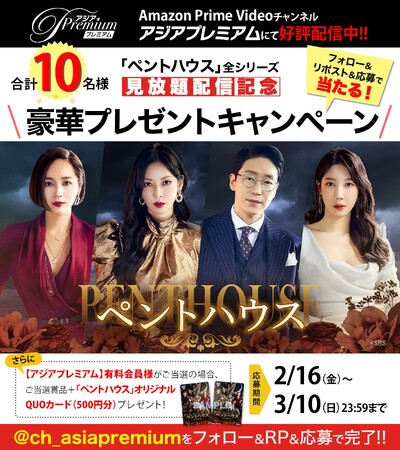 PLAN Kエンタテインメント株式会社(東京都品川区、代表取締役社長 崔相基)がAmazon Prime Videoチャンネルに開局したアジアコンテンツ専門チャンネル『ドラマ&エンタメ☆アジアPremium』(以下、アジアプレミアム)では、アジアプレミアム公式X(旧Twitter)にて、来たる3月3日に大ヒットドラマ「ペントハウス」が全シリーズ見放題解禁となることを記念し、「ペントハウス」豪華関連グッズが当たるプレゼントキャンペーンを実施いたします。