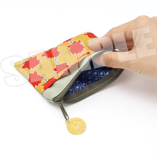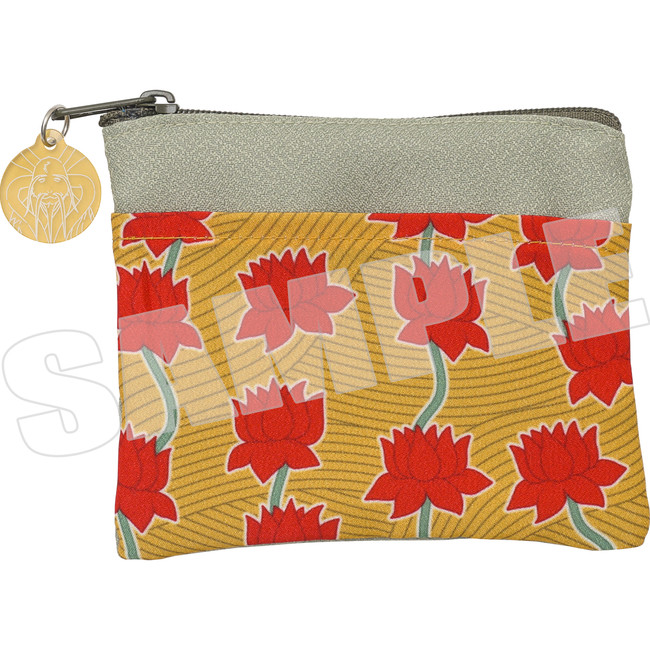 ちりめん風の生地に宗師の衣装柄をプリントしました。内生地にも柄をプリントしています。ポケット付きで小物の収納に便利。ファスナーには宗師がほほ笑むチャームがついています。